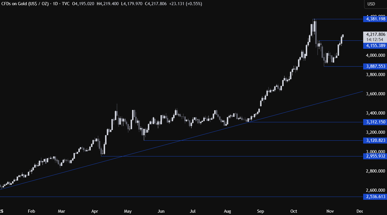 昨日黃金突破重要阻力位,并将漲勢延伸至 4200 美元上方。當前價格走勢并非由基本面驅動,「空頭回補」似乎是最合理的解釋。雖然本周二公布的 ADP 就業數據偏軟,但若這真是推動上漲的因素,那麽市場應當在周二即做出更強烈反應,而不是延後一日。随着美國政府重新開放,關鍵經濟數據(如非農就業 NFP 和 CPI)将陸續恢複發布,這些都将成爲黃金的重大風險事件。