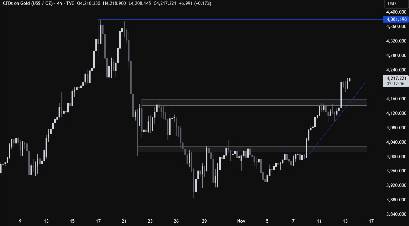 在 4 小時圖中,可見 4150 美元附近形成新的強支撐區間,并與上行趨勢線重疊形成共振。若出現回調,買方大概率會在該支撐位附近入場,止損位置明確,目标仍是沖擊新高。空頭則希望看到該區域被有效跌破,以便推動金價回落至 4000 美元整數關口。
