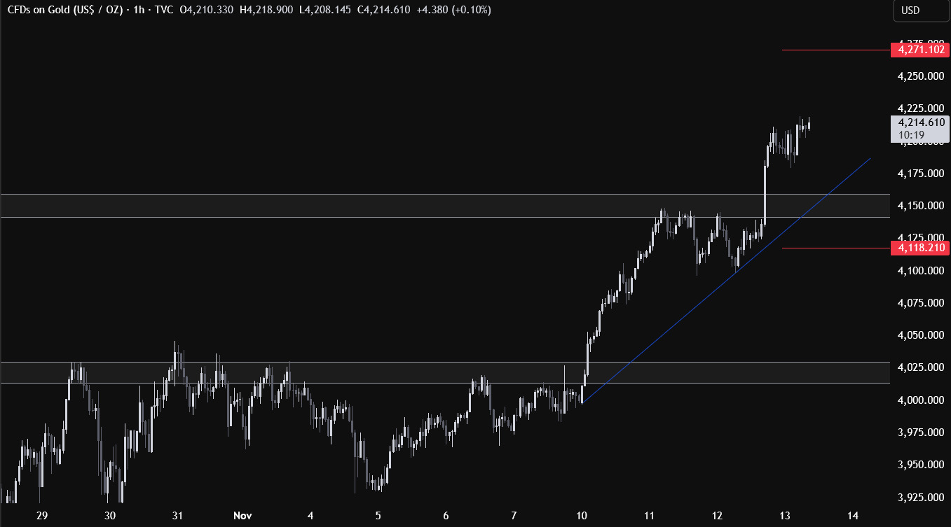 截至發稿,現貨黃金上漲 0.7% 至4,227.15 美元,日内最高觸及4239美元,爲10月21日以來最高水平,此前連續4個交易日收高。