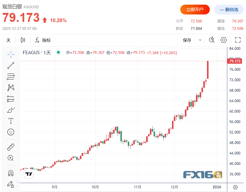 FX168财經報社(北美)訊 周五(12月26日),貴金屬市場迎來曆史性時刻:現貨白銀史上首次突破77美元/盎司,黃金與鉑金同步刷新紀錄高位。在市場押注美聯儲2026年繼續降息、美元走弱以及地緣緊張局勢升溫的背景下,避險資金持續湧入,推動貴金屬在年末流動性偏薄的環境中加速上漲。分析人士指出,此輪漲勢不僅是傳統避險交易的延續,更體現出在去美元化與供應結構緊張背景下,硬資産配置需求的全面擡升。