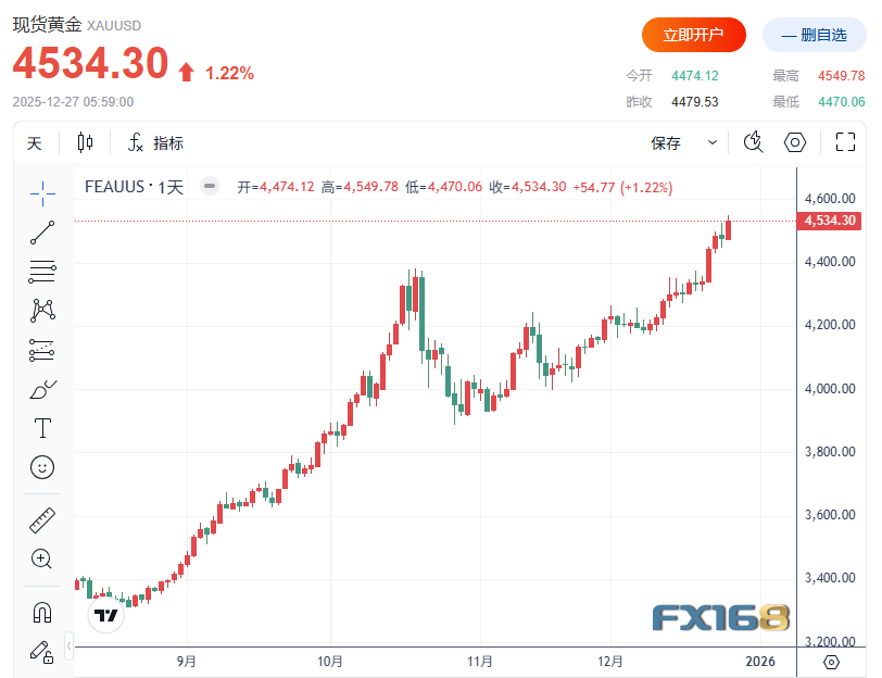 黃金同樣維持強勢。美市尾盤,現貨黃金上漲超1.2%至4,534.20美元/盎司,盤中刷新紀錄至4,549.78美元;與此同時,COMEX 2月黃金期貨上漲1.3%至4,559美元,繼續鞏固曆史高位區間。