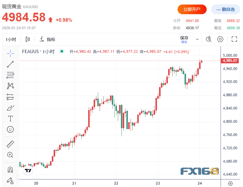 現貨黃金盤中刷新紀錄高位後維持強勢,繼續逼近5000美元關口。