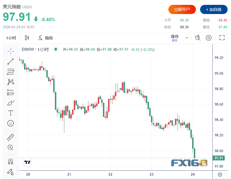美市盤中,美元指數DXY失守98關口,爲去年12月30日以來首次,日内跌幅0.30%。
