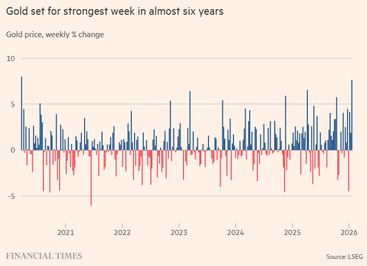 本周黃金累計漲幅超過8%,勢創2008年來最佳單周表現。