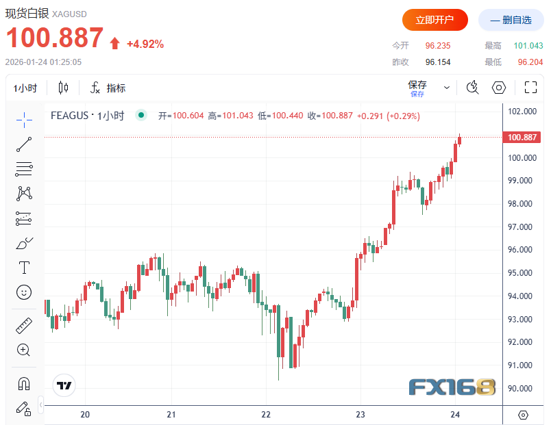 FX168财經報社(北美)訊 周五(1月23日),貴金屬市場再度上演強勢拉升:現貨白銀盤中首次站上101美元/盎司上方,刷新曆史紀錄;黃金同步再創高點,向5000美元/盎司整數位發起沖擊。在投資者對避險配置的需求顯著升溫之際,「去美元化」叙事與降息預期共同放大了資金對硬資産的追逐。
