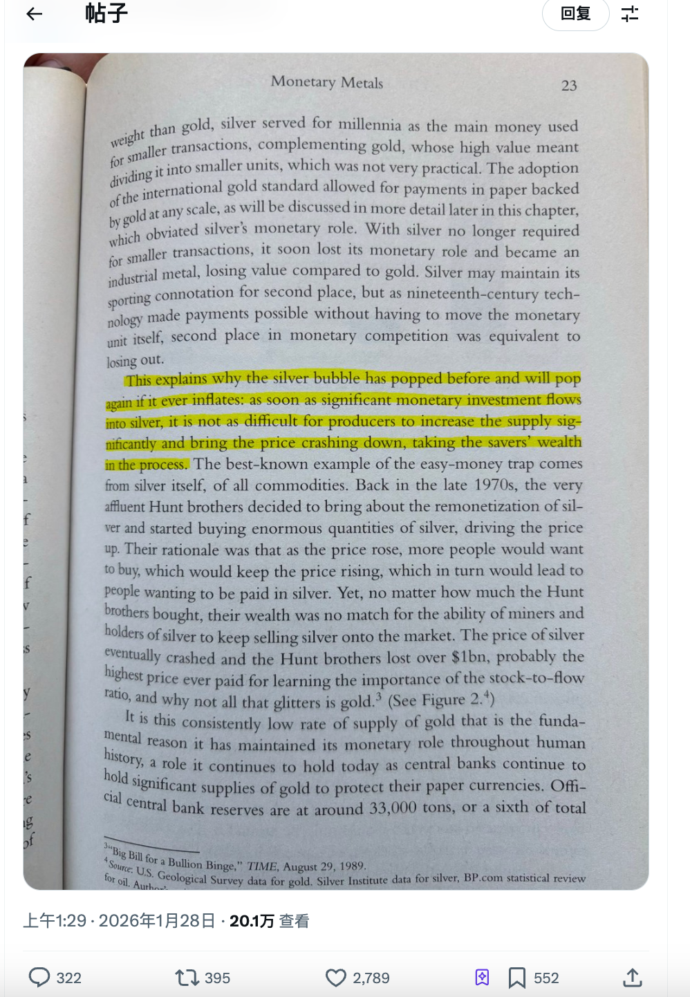 書裏那段被高亮的話大意是:白銀泡沫破過,以後還會再破。因爲一旦大量資金湧入白銀,礦商可以輕松增加供應,把價格砸下來,儲蓄者的财富跟着蒸發。