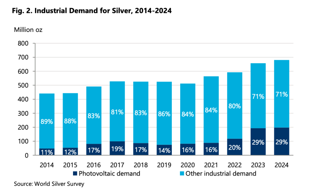 先看一組數據。據 World Silver Survey 2025 調查報告,2024 年白銀工業需求達到 6.805 億盎司,曆史新高。這個數字占全球總需求的 60% 以上。