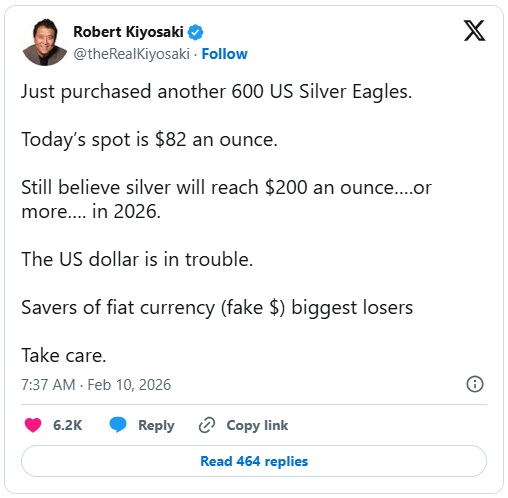24K99訊 知名财經網站Finbold周二(2月10日)撰文稱,随着白銀價格回升至82美元/盎司,知名投資者、暢銷個人理财書《富爸爸窮爸爸》作者羅伯特·清崎(Robert Kiyosaki)在社交媒體平台X發文稱,他剛剛向白銀投入了約5萬美元,并将2026年白銀目标價上調至200美元/盎司。