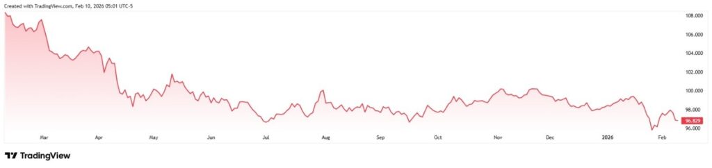 這位投資者還認爲,美元「正陷入麻煩」。事實上,美元指數(DXY)——用于衡量美元兌一籃子主要貨幣匯率表現的指數——近幾個月持續走弱,并在過去一年累計下跌超過10%。