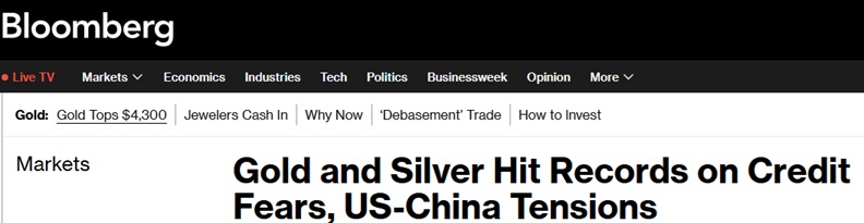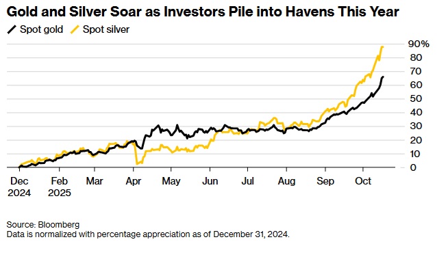 FX168财經報社(亞太)訊 周五(10月17日)亞市早盤,黃金和白銀價格升至曆史新高,美國彭博社分析稱,這歸因于對美國經濟信貸質量的擔憂以及華盛頓和北京之間摩擦加劇增強了對避險資産的需求。