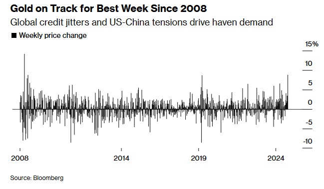 金價延續了自8月份以來的強勁漲勢,有望創下2008年以來的最大單周漲幅。