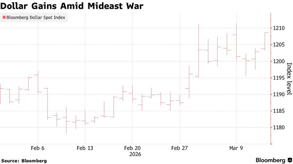 自2月28日沖突爆發以來,彭博美元現貨指數(Bloomberg Dollar Spot Index)已上漲1.8%,投資者紛紛湧入美元,同時油價上漲也爲美元提供支撐。